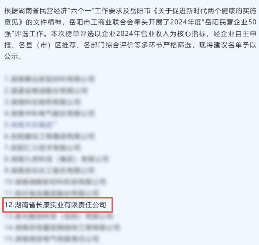 近日,岳陽(yáng)市工商業(yè)聯(lián)合會(huì)發(fā)布《2024年度“岳陽(yáng)民營(yíng)企業(yè)50強(qiáng)”建議名單的公示》,湖南省長(zhǎng)康實(shí)業(yè)有限責(zé)任公司赫然在列,用硬核實(shí)力斬獲這份城市級(jí)榮譽(yù)。